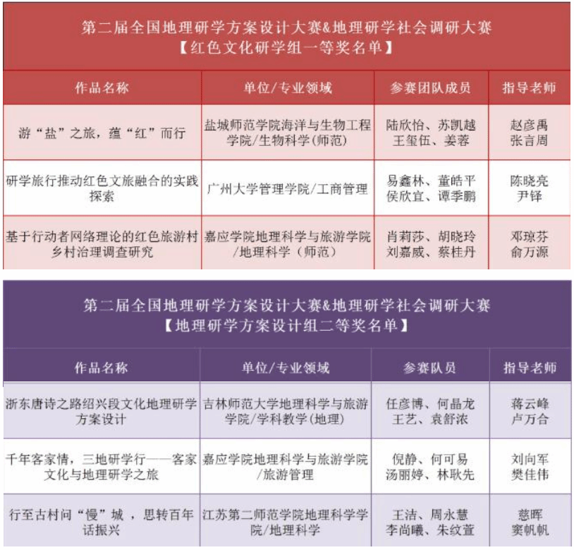 近日,第二届全国地理研学方案设计大赛&地理研学社会调研大赛结果在线公布,来自全国大中小院校师生和企事业单位的300多份参赛作品先经过组委会双盲审评选出排名前60%的作品,再由业内资深专家集中评审评选出最终获奖的作品。大赛分为地理研学方案设计、地理研学社会调研和红色文化研学三个组别。我校地理科学与旅游学院学子获得红色文化研学一等奖和地理研学方案设计二等奖各1项。