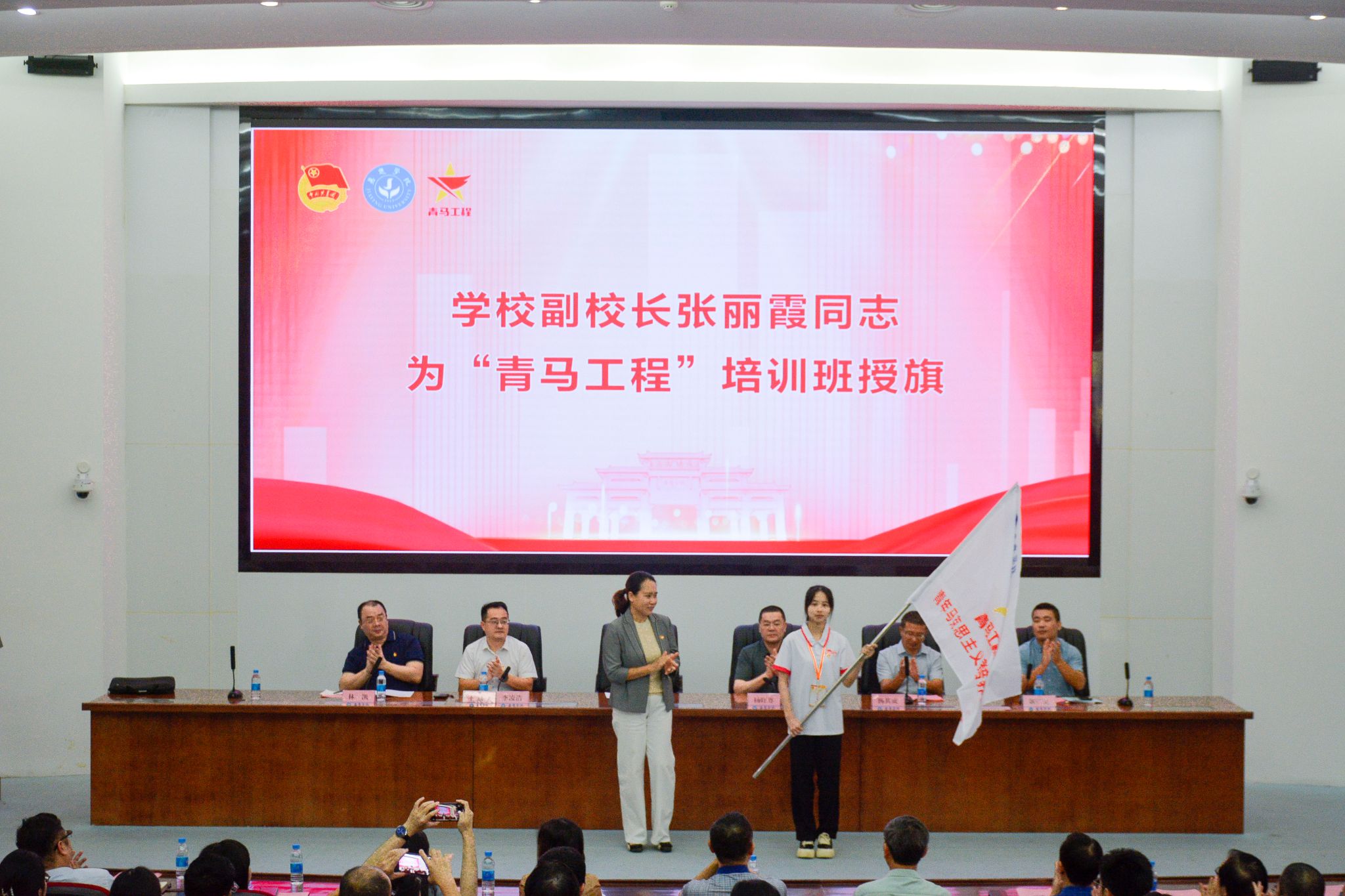 会上,张丽霞向新一期的“青马工程”培训班学员代表授旗,“青马工程”培训班优秀学员代表分别作了发言。并向2023—2024学年“青马工程”培训班学员代表和优秀学员代表颁发了结业证书和荣誉证书。