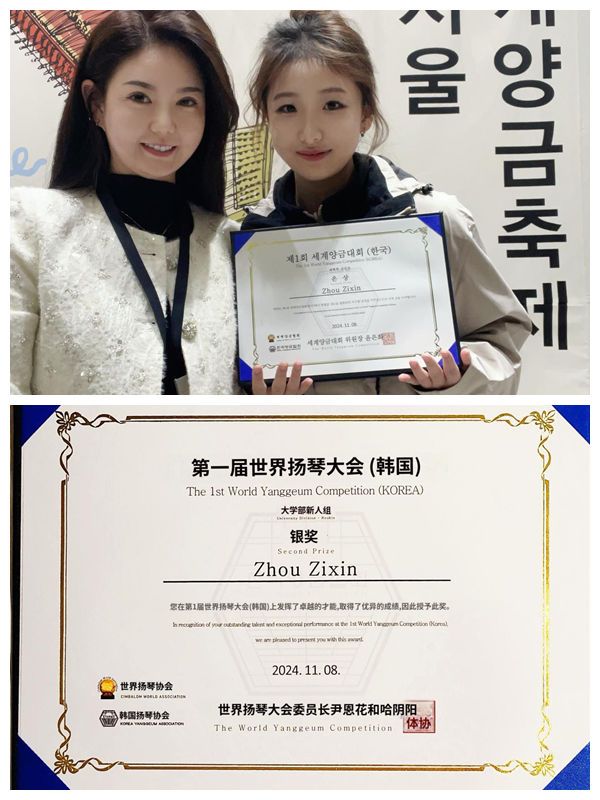 11月3至8日,第十七届世界扬琴大会暨首届世界扬琴大赛在韩国首尔举行,我校音乐与舞蹈学院22级音乐学专业学生周子欣(指导老师姚雪博士)获得“大学部新人组银奖”。