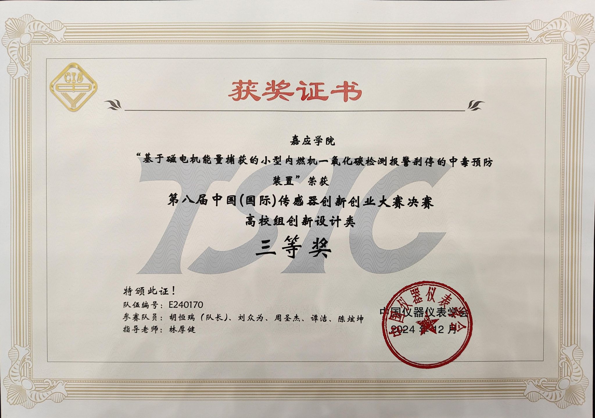 日前,2024年第八届中国(国际)传感器创新创业大赛决赛(China(International) Transducer & Sensor Innovation Contest, 简称TSIC)在郑州举行,由胡恒瑞、刘众为、陈炫坤等成员组成的嘉应学院代表队摘得国赛三等奖。