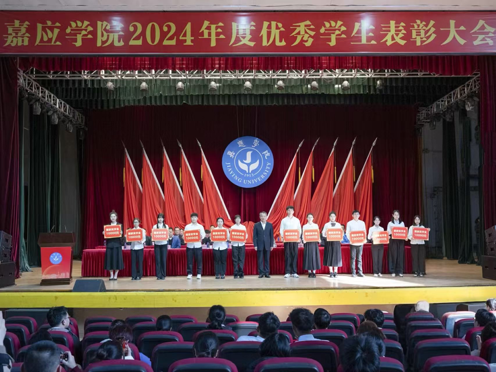罗嘉文在讲话中对受到表彰的同学表示热烈祝贺,向辛勤耕耘的教师表示衷心感谢。他指出,学校坚持和加强党对学校工作的全面领导,落实立德树人根本任务,扎实推动学校高质量发展。过去的一年,学校成功获批硕士学位授予单位,办学层次实现新跃升。这一突破更是为同学们搭建了更为广阔的成长舞台,同学们也与学校事业发展同向同行,在各条赛道上奋勇争先,取得诸多亮眼成绩。同时,他对同学们提出三点希望:一是要勇立凌云之志,做胸怀天下、志存高远的嘉园人;二是要勇怀奋斗热忱,做根基扎实、素养全面的嘉园人;三是要勇于担当作为,做齐心协力、砥砺前行的嘉园人。