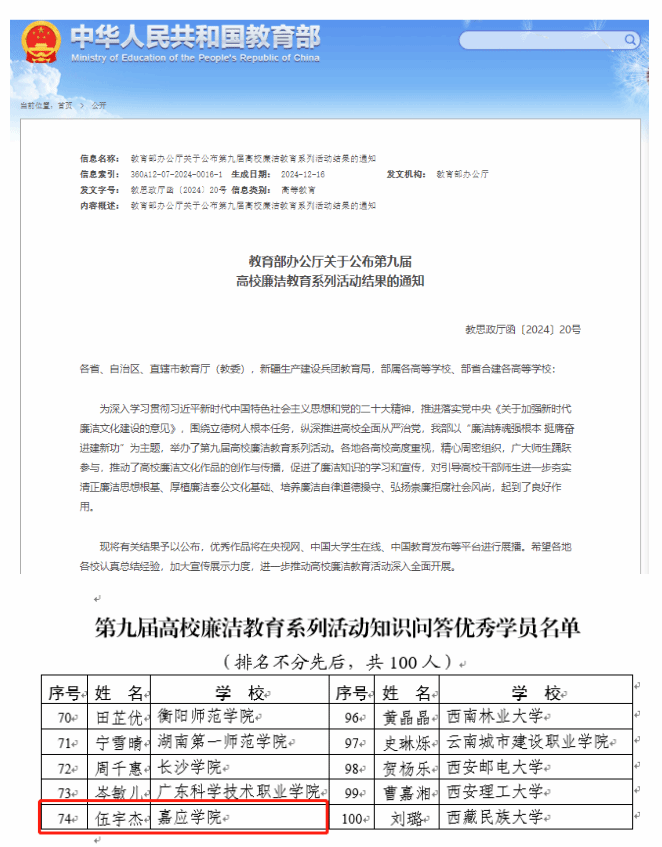 近日,教育部办公厅公布了第九届高校廉洁教育系列活动结果,我校学子伍宇杰在第九届高校廉洁教育系列活动知识问答中获得佳绩,荣获“优秀学员”称号。