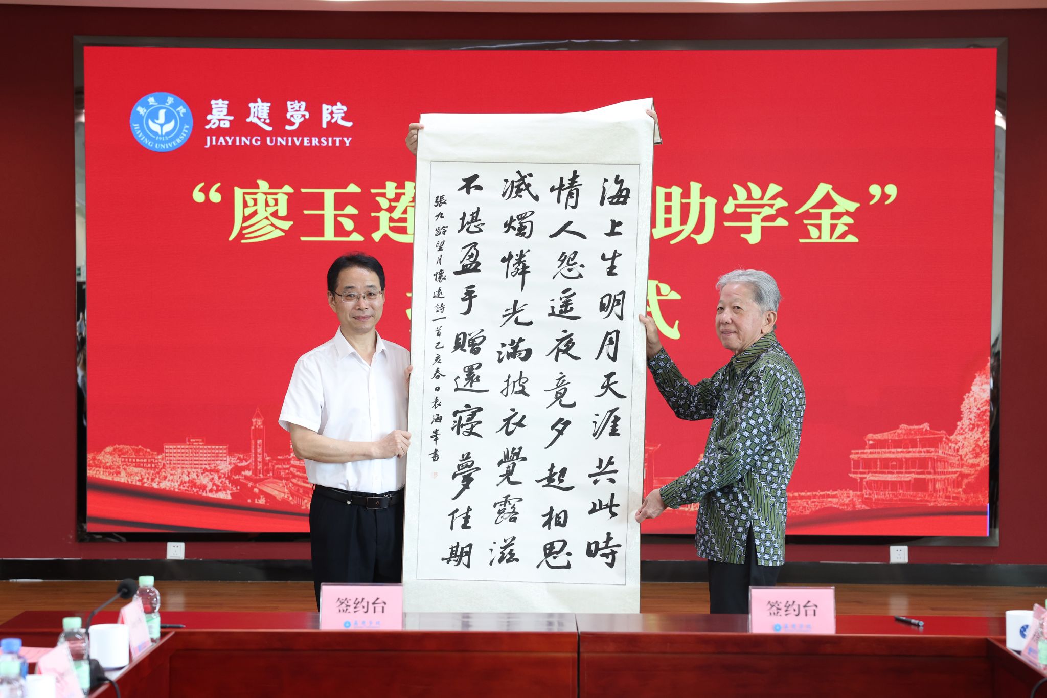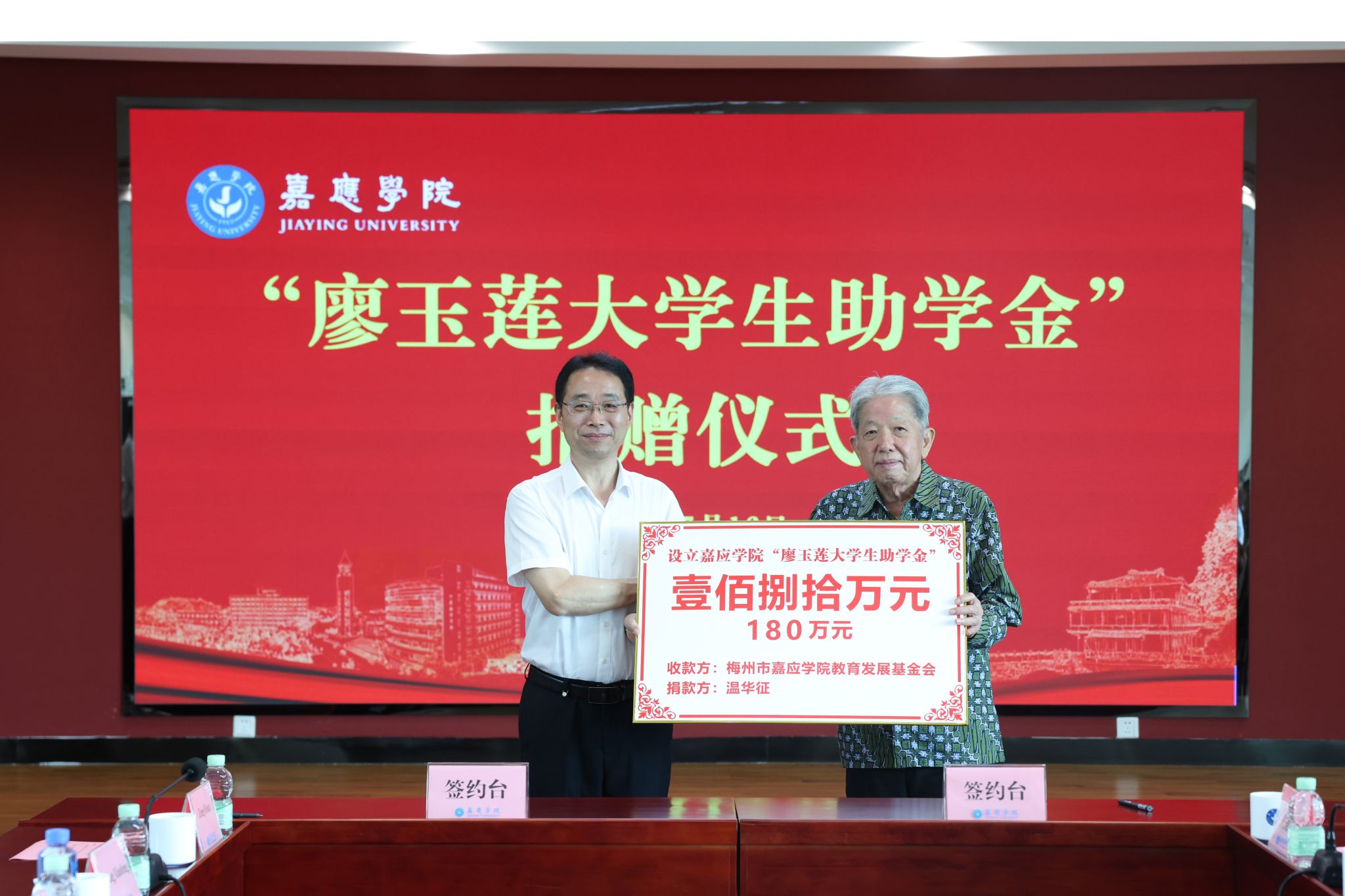 捐赠仪式上,陈文海与温华征还进行了捐赠牌匾和捐赠证书的交接。温华征与学校教育发展基金会代表签署了捐赠协议。与会人员共同观看了嘉应学院宣传片。