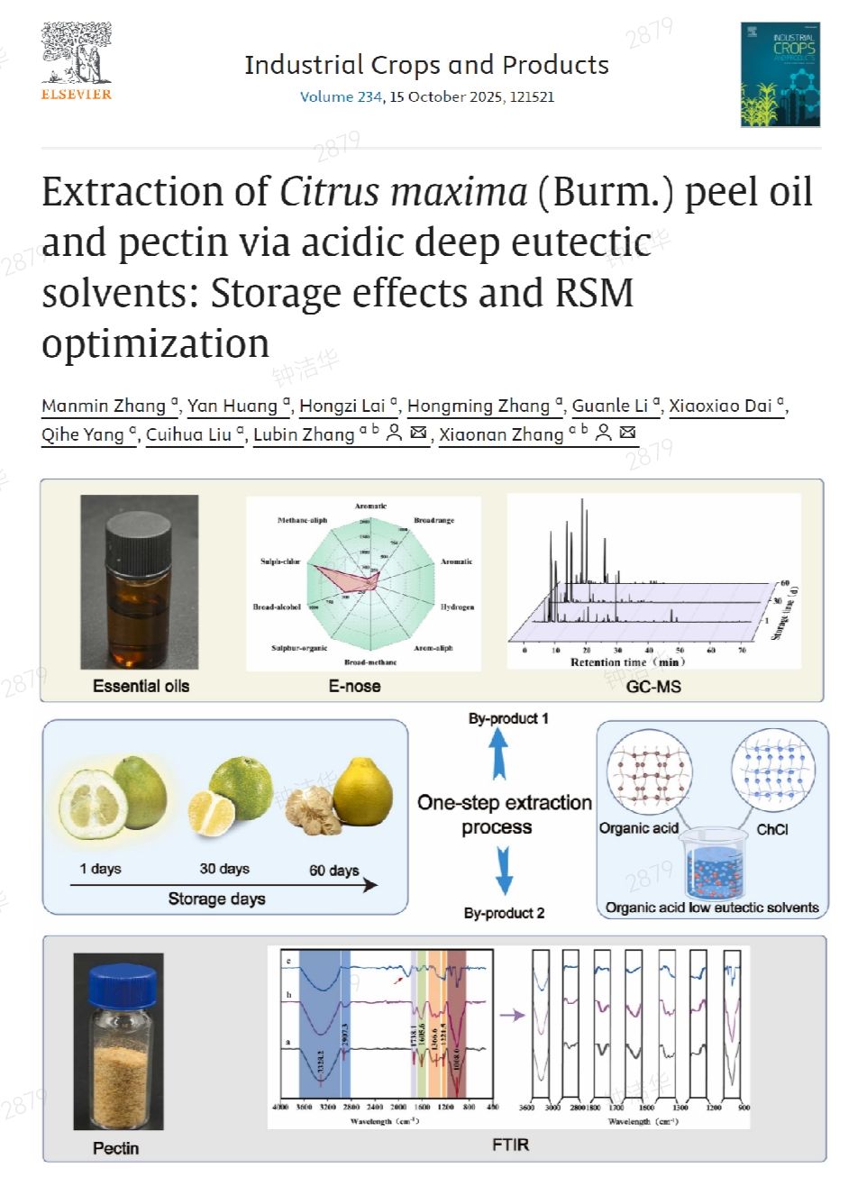 张漫敏发表了题为“Extraction of Citrus maxima (Burm.) peel oil and pectin via acidic deep eutectic solvents: Storage effects and RSM optimization”的研究论文。该研究针对梅州地区柚子产量巨大、柚皮资源未充分利用的问题,创新性地采用6种有机酸作为氢键供体与氯化胆碱组合,优化配置了酸性低共熔溶剂(DES)体系,运用响应面法优化了柚皮中精油和果胶的提取工艺,并通过电子鼻/GC-MS技术分析了精油香气成分。同时,研究揭示了柚皮储存时间对提取效果的影响。该研究为发展绿色节能的天然产物提取技术提供了新思路,并为柑橘类水果采后保鲜及副产物高效利用提供了重要的技术指导。