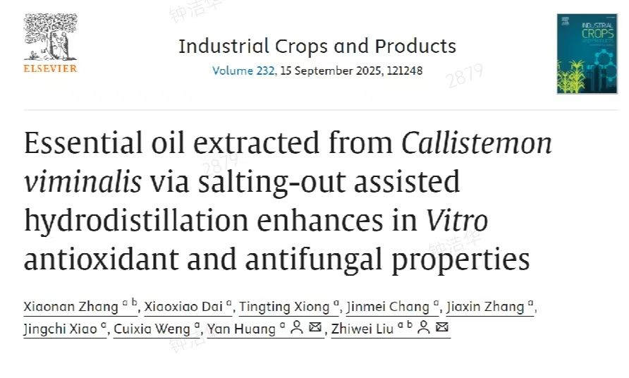 张晓南发表了题为“Essential oil extracted from Callistemon viminalis via salting-out assisted hydrodistillation enhances in vitro antioxidant and antifungal properties”的研究论文。该研究聚焦客家地区特色植物红千层(桃金娘科药用植物),通过采用蒸馏萃取技术优化其叶片精油的提取效率,并深入评估了该精油的体外抗氧化和抗真菌活性。研究发现,该精油对炭疽病致病真菌的抑制率高达87.12%,对ABTS/DPPH自由基具有显著的清除作用。这充分表明红千层精油可作为优异的天然抗氧化剂和植物源抗菌剂,为减少化学合成药物残留带来的危害提供了新选择,也为深度开发利用天然植物活性成分奠定了理论基础。
