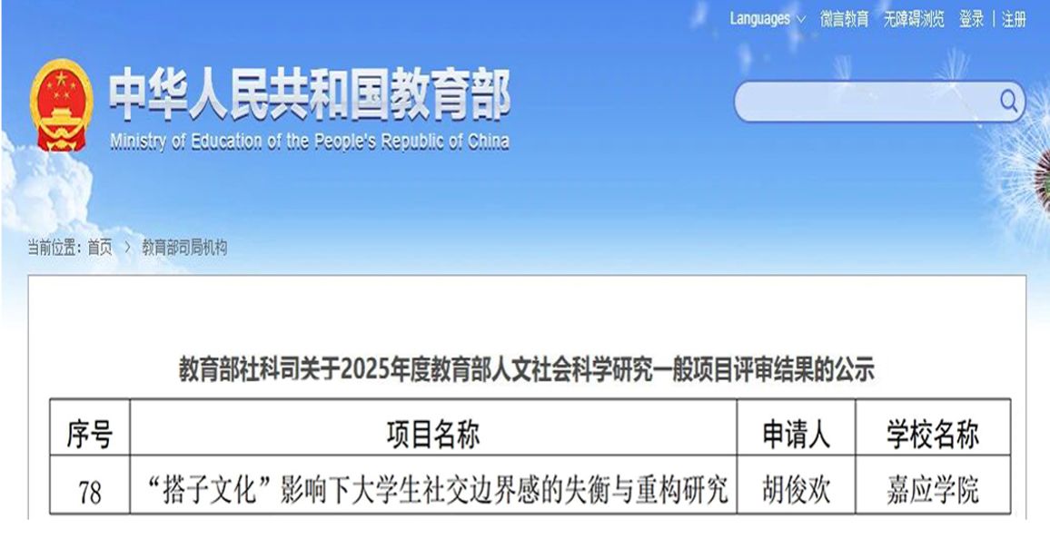 近日,教育部社会科学司公示2025年度教育部人文社会科学研究专项任务项目(高校辅导员研究)评审结果,我校美术学院专职辅导员胡俊欢老师主持的《“搭子文化” 影响下大学生社交边界感的失衡与重构研究》,成功获批该专项项目。