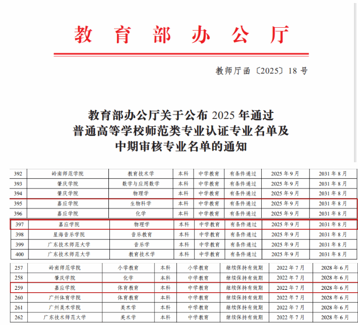近日,教育部办公厅发布《关于公布2025年通过普通高等学校师范类专业认证专业名单及中期审核专业名单》(教师厅函〔2025〕18号),我校生物科学、化学和物理学3个专业顺利通过教育部师范类专业第二级认证,认证结论有效期为六年(2025年9月至2031年8月)。同时,体育教育专业也顺利通过师范类专业认证中期审核,有效期至2028年6月。