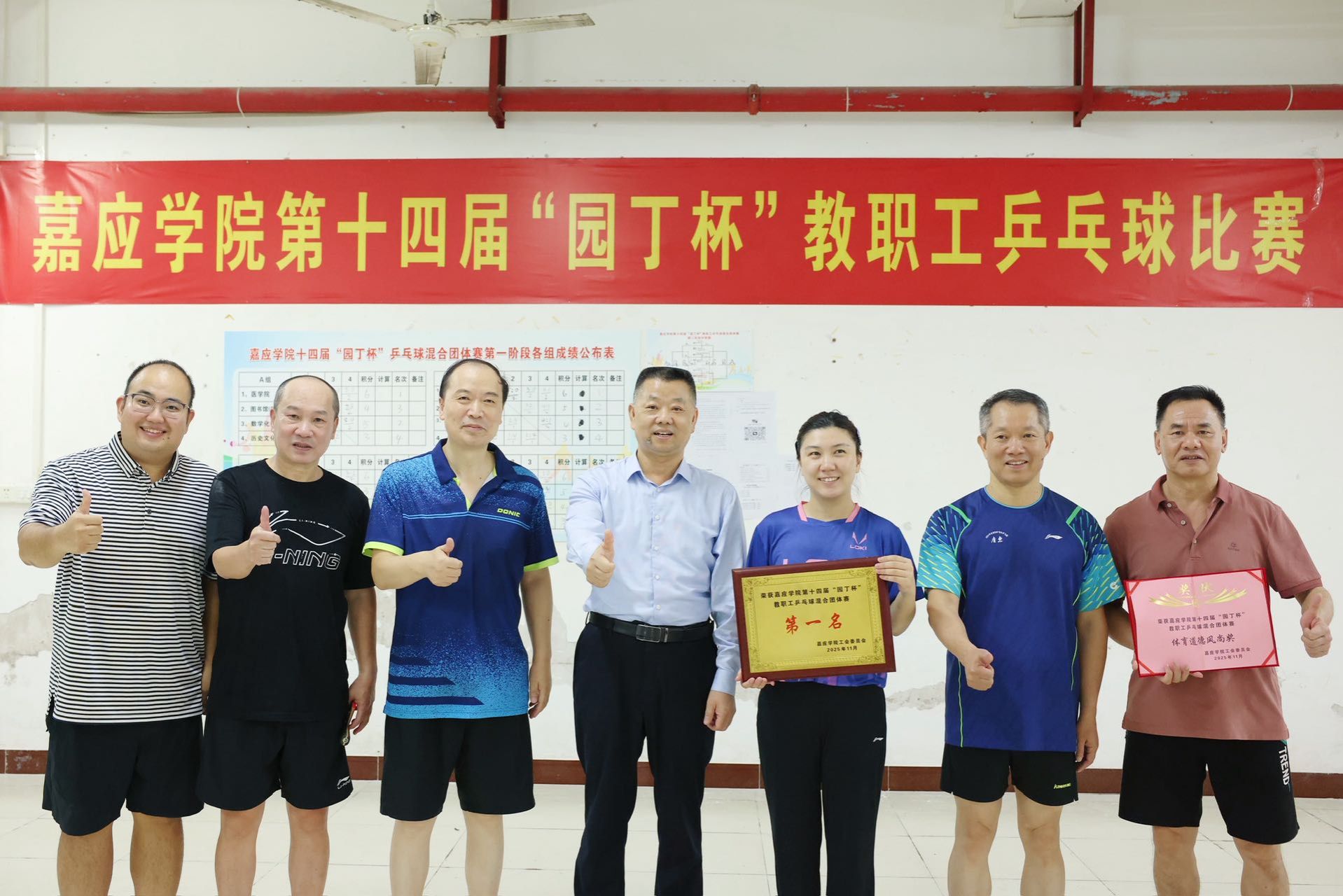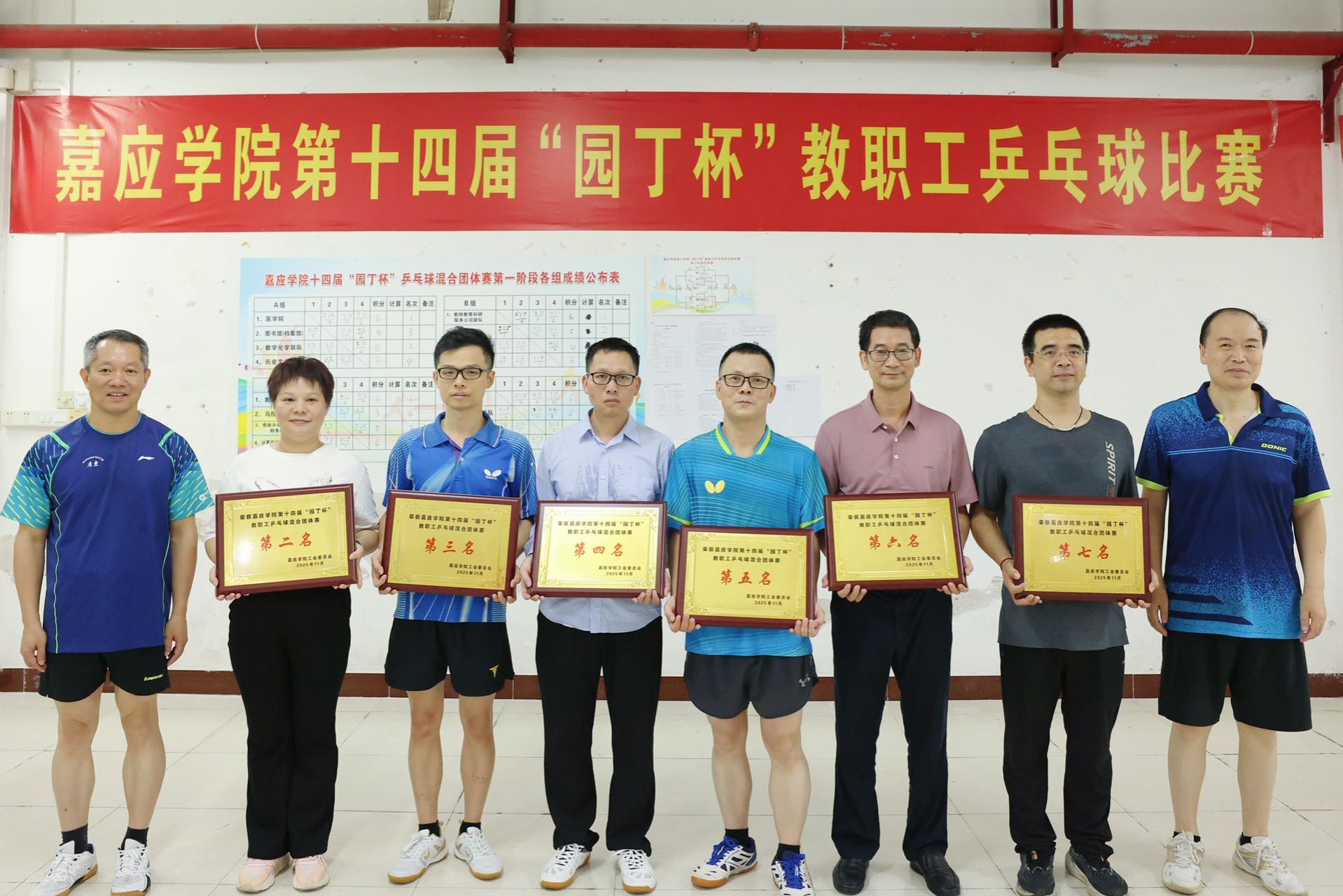 为丰富教职工文化生活,增强团队凝聚力,营造健康向上的校园氛围,11月1日至10日,我校在学校飞马城三楼球馆举办第十四届“园丁杯”教职工乒乓球比赛。经过激烈角逐,体育学院与医学院并列混合团体赛第一名,教科学院获第二名,教师教育科研服务公司联队、数学化学联队分获三、四名,后勤基建联队、党政办审计资产财务联队、物电学院分获第五至七名。体育学院、计算机学院工会联队及马院经管联队获“体育道德风尚奖”。学校校长曹建忠,副校长罗嘉文、袁铎出席颁奖仪式并为获奖团队颁奖。