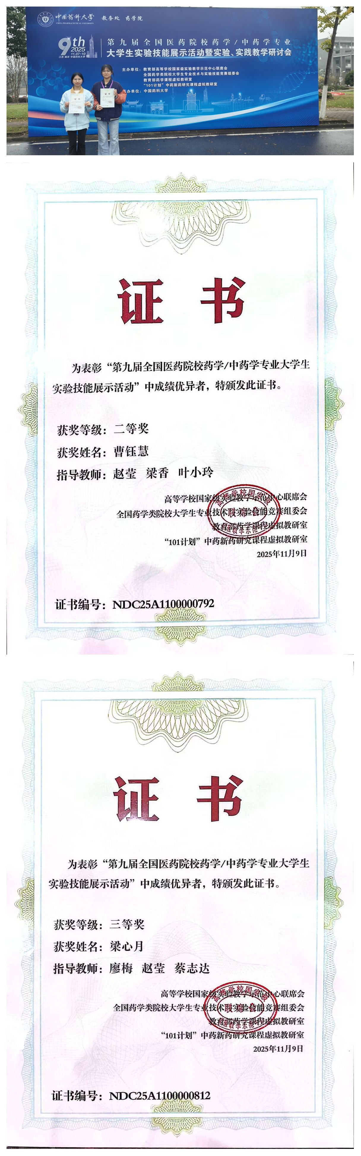 近日,第九届全国医药院校药学/中药学专业大学生实验技能展示活动圆满落幕。我校医学院2023级药学专业本科生曹钰慧、梁心月同学凭借扎实的专业功底与精湛的实验技能,在激烈角逐中脱颖而出,分别荣获二等奖和三等奖。
