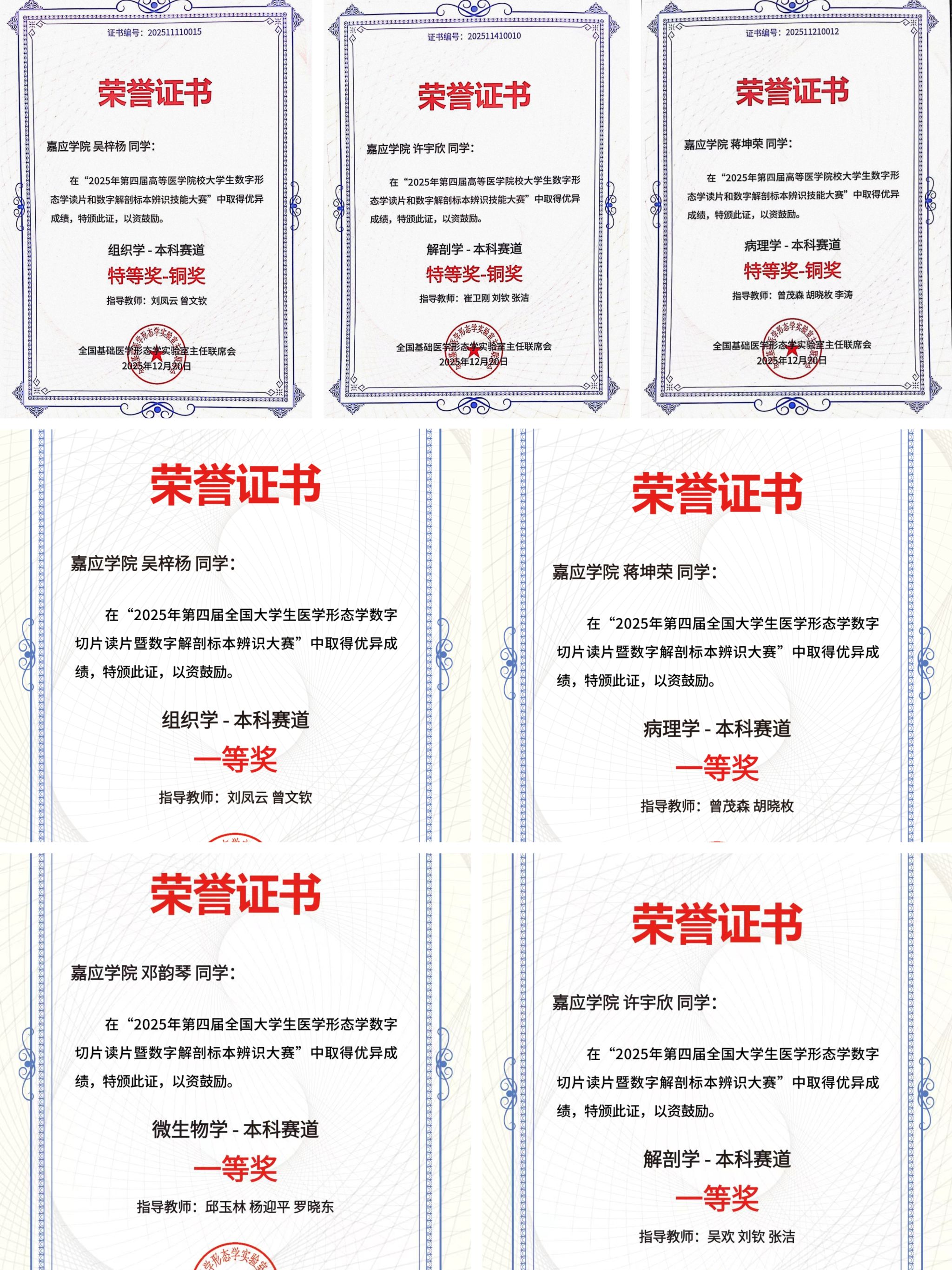 近日,2025年第四届全国高等医学院校大学生形态学读片和数字解剖标本辨识技能大赛圆满落幕。经过激烈角逐,我校荣获优秀组织奖,吴梓杨等26名同学在比赛中表现突出,共获一等奖4项、二等奖10项、三等奖13项。其中,吴梓杨、许宇欣、蒋坤荣3名同学成功晋级全国线下总决赛,并最终荣获特等奖,展现了我校医学学子的扎实基础与综合能力。