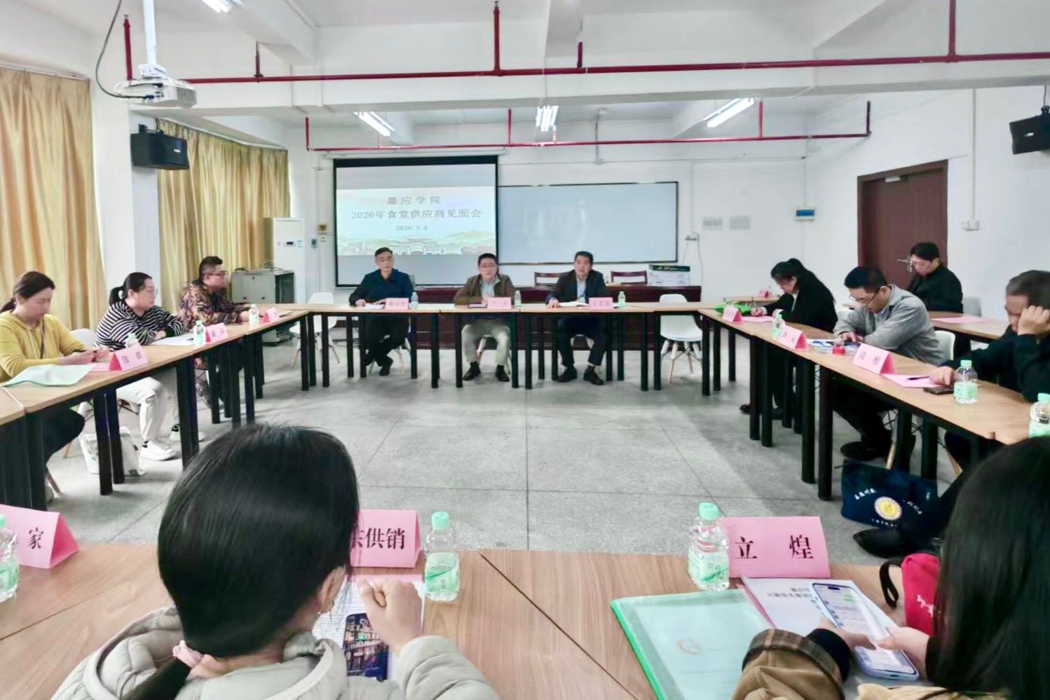 为进一步规范学校食堂物资供应管理,切实守护师生“舌尖上的安全”,提升餐饮服务质量,3月5日,学校在成教楼307室召开2026年食堂供应商见面会。中山大学帮扶工作队队长兰宇,后勤服务集团负责人,饮食服务中心相关人员以及学校自营食堂2026年度供应商代表参加会议。