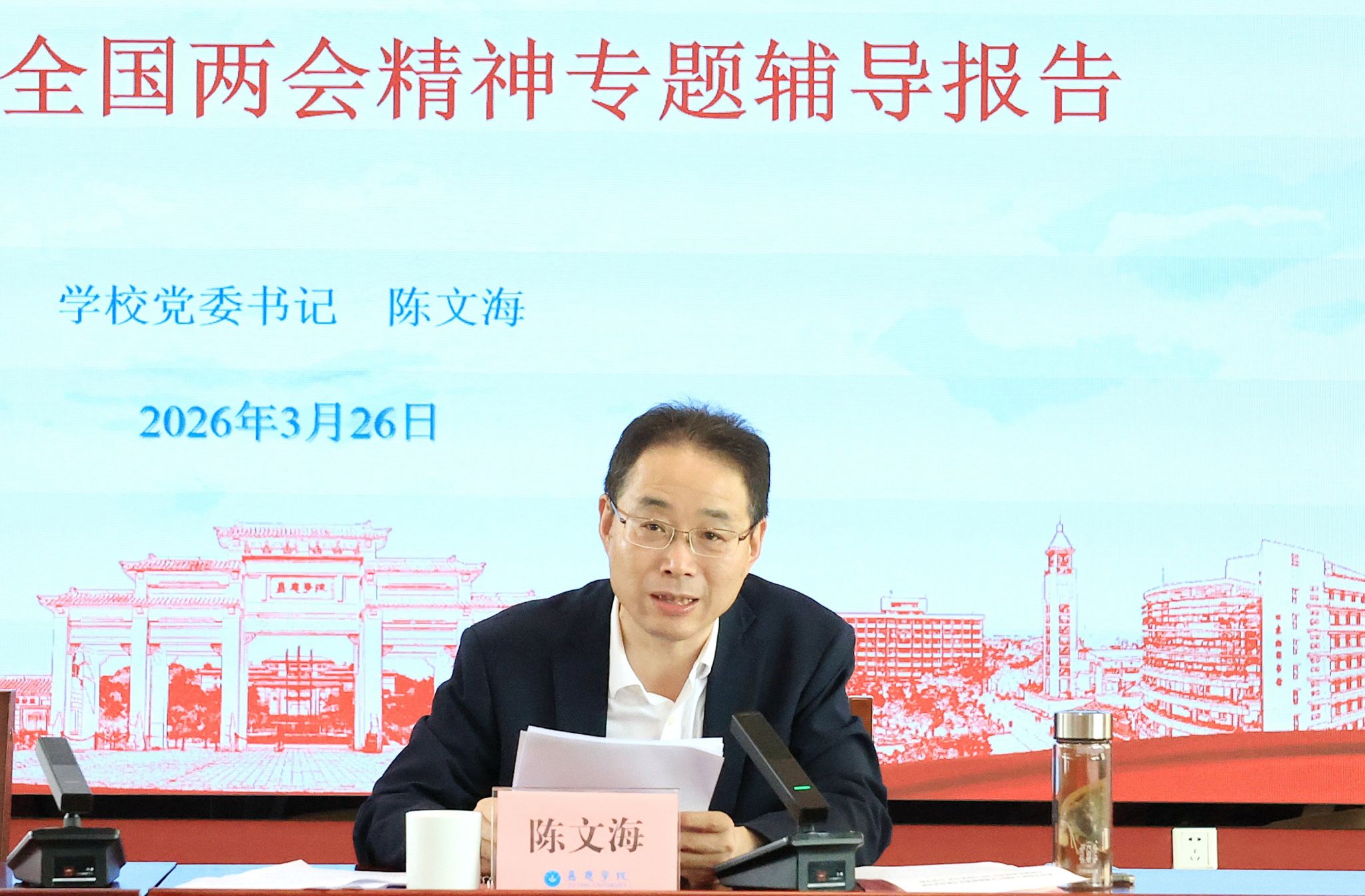 陈文海围绕“以两会精神汇聚奋进力量 以正确政绩观引领高质量发展”主题开展领学,重点学习习近平总书记在全国两会上的重要讲话精神、全国两会精神,习近平总书记关于树立和践行正确政绩观的重要论述及《习近平关于树立和践行正确政绩观论述摘编》。他结合“十五五”开局之年的新形势新任务,从“准确把握开展树立和践行正确政绩观学习教育的总要求”“深刻理解树立和践行正确政绩观的丰富内涵”和政府工作报告中对教育工作的重大部署等方面系统解读核心思想、关键要点与落实举措。他要求,一要提高政治站位,在深学细悟中把准方向、凝聚共识,深刻把握学校事业发展的历史方位。正确政绩观是发展的“导航仪”和“定盘星”,两会精神是行动的“任务书”和“动员令”,学习领会的关键在于“结合”与“转化”。二要聚焦关键环节,在学查改贯通中增强实效、锤炼作风,推动学习教育走深走实。坚持“深学”与“细悟”相结合,筑牢思想根基;坚持“查摆”与“整改”相贯通,解决突出问题,扎实推进质量文化年建设,提升人才培养质量;坚持“党性”与“实践”相统一,净化政治生态。三要强化担当作为,在推动发展中检验成果、创造实绩,奋力开创“十五五”高质量发展新局面。要以“高质量党建”引领高质量发展,要以“系统观念”谋划推动发展,要以“实干担当”破解发展难题,确保学校重大决策部署落到实处。