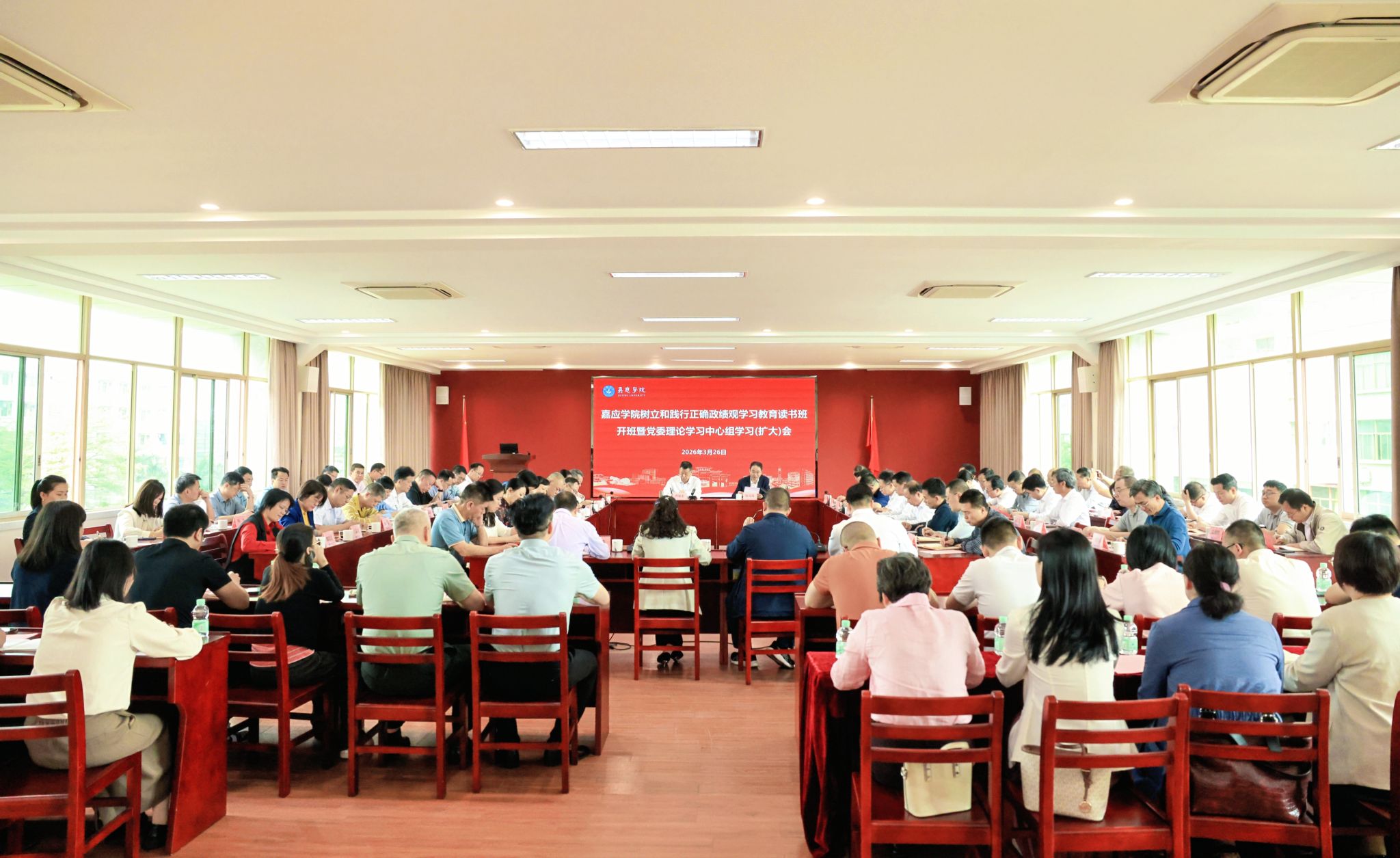 3月26日上午,我校在何侨生大楼526会议室举办树立和践行正确政绩观学习教育读书班暨党委理论学习中心组学习(扩大)会,学校党委书记陈文海作开班动员暨学习贯彻习近平总书记关于树立和践行正确政绩观的重要论述和全国两会精神专题辅导报告。校长曹建忠,副校长罗嘉文、袁铎、张丽霞、陈建存,纪委书记苏文记,中山大学帮扶工作队队长兰宇,各职能部门、教辅单位主要负责人,各二级单位党委(党工委、党总支、直属支部)书记,机关党委、马克思主义学院、外国语学院党员干部代表参加了会议。
