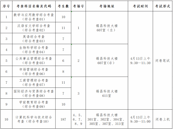嘉应学院2024年退役大学生士兵普通专升本综合考查定于4月13日(星期六)上午9:30在江北校区锡昌科技大楼举行,逾期未缴交报考费的退役大学生士兵考生不得参加学校专业组综合考查。各专业综合考查安排见下表,考生所在考场详见附件1。