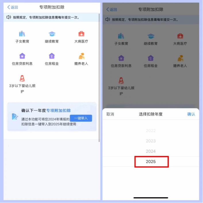 选择要填报的专项附加扣除项目,选择扣除年度“2025”,再将相关信息录入即可。