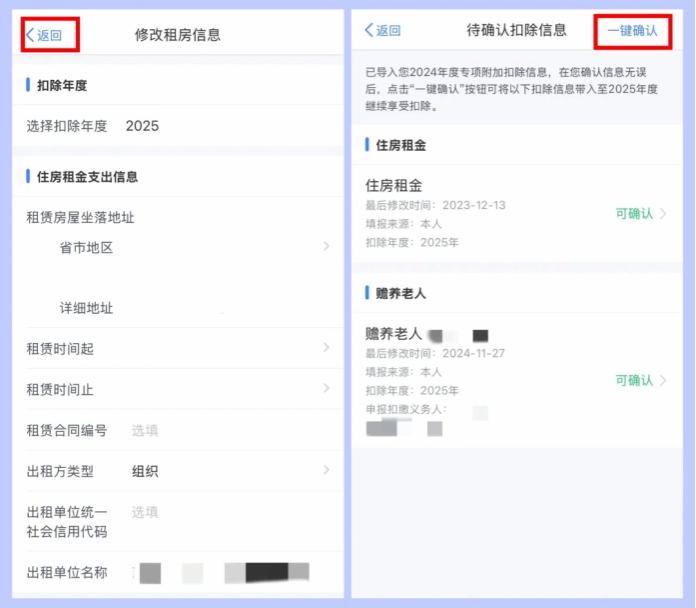 一、2025年专项附加扣除信息无变动的,只需在2024年基础上确认即可。核对信息无误后,点击【返回】-【一键确认】。