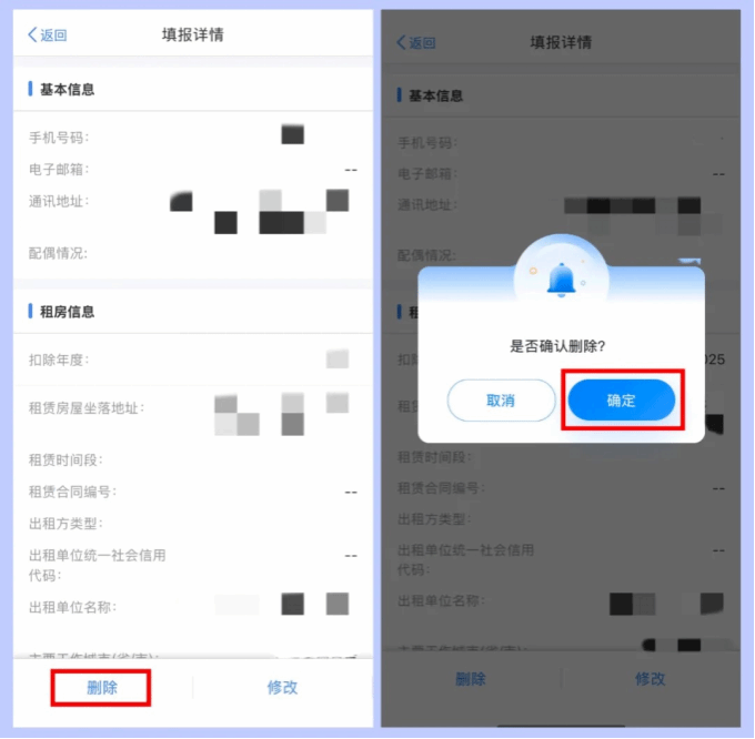 以2025年不再享受住房租金专项附加扣除的情况为例。在专项附加扣除信息确认界面,点击【删除】-【确定】。