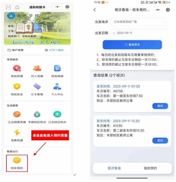 1. 请登录微信搜索“嘉应学院校园一卡通”小程序,凭校园一卡通工号进入校车预约用户端系统,点击“智慧出行-校车预约”进行预约。预约需提前一天,截止时间为发车前一天17:00前,往返的车次需单独预约。