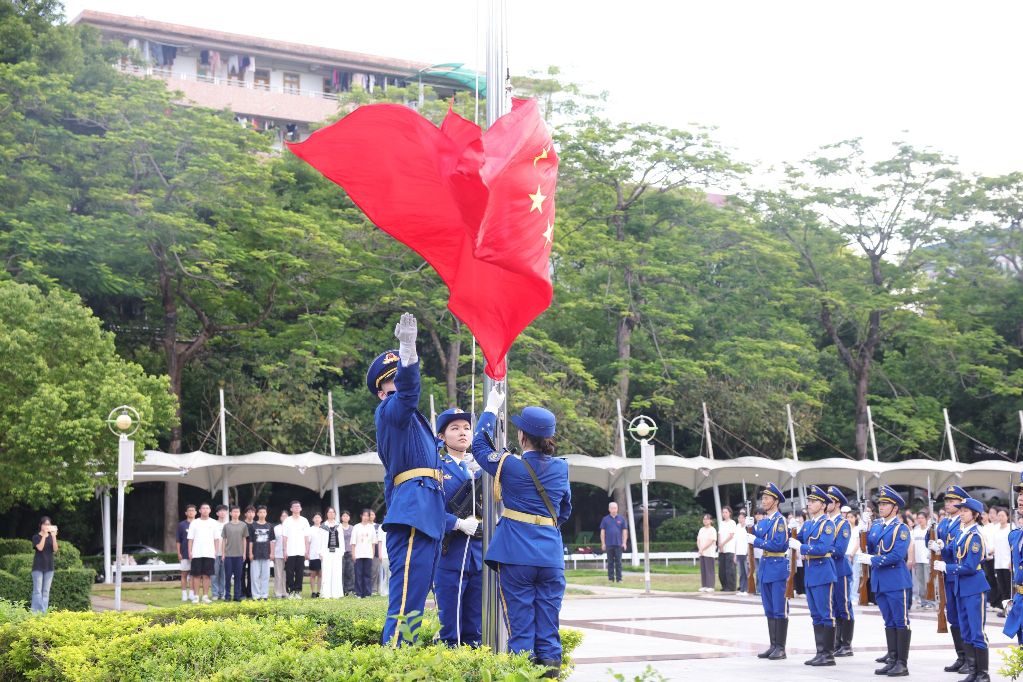 仪式现场,英姿飒爽的国旗护卫队迈着铿锵有力的步伐,护卫五星红旗步入广场。在雄壮的《义勇军进行曲》中,鲜艳的国旗冉冉升起,全体师生肃立行注目礼,齐声高唱国歌,昂扬的歌声在校园上空回荡。