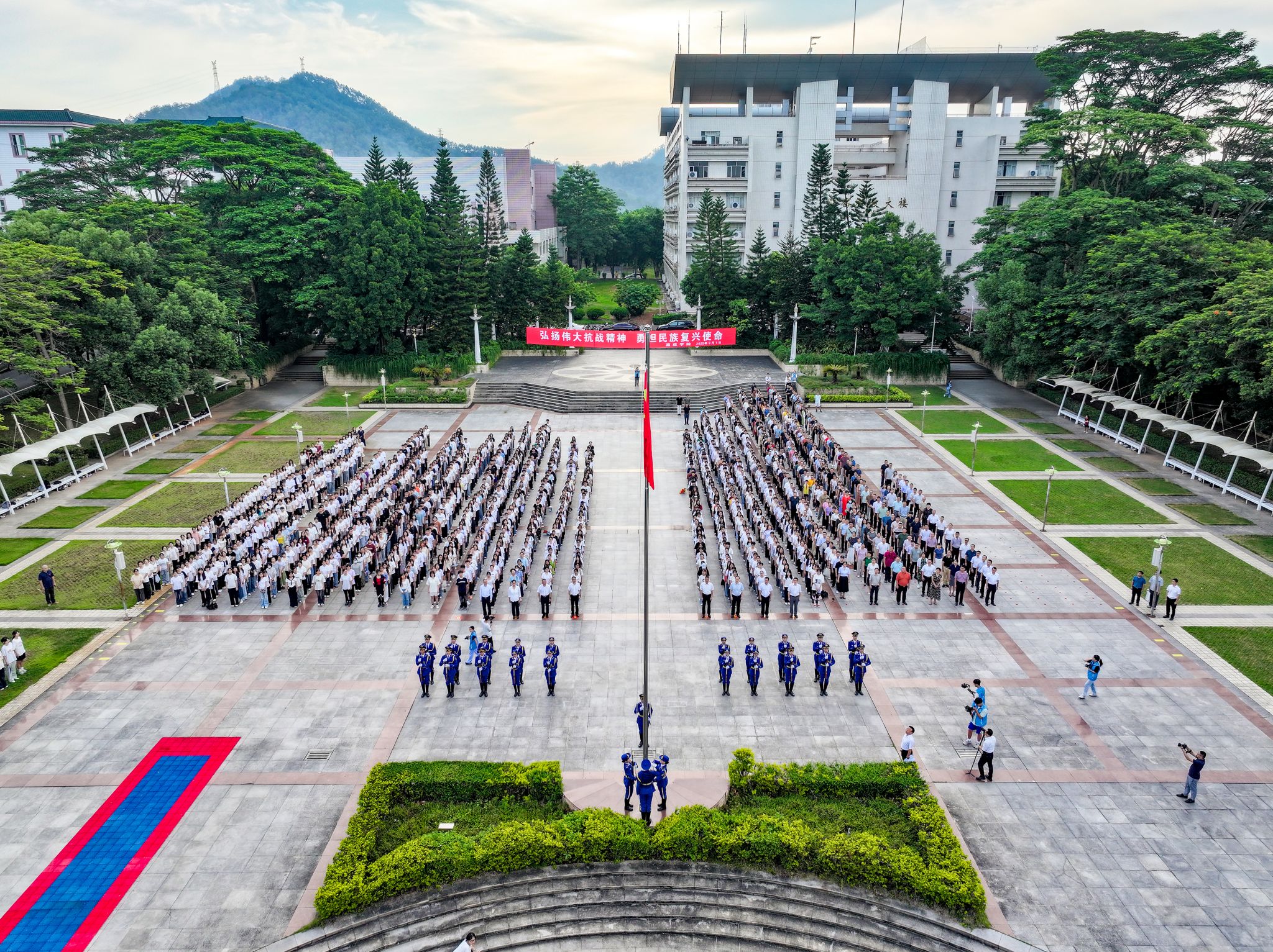 9月1日早上,我校在世纪广场庄严举行“弘扬伟大抗战精神 勇担民族复兴使命”为主题的新学期升旗仪式。学校领导、党政群团科研教辅部门、继续教育学院、教师教育学院(教师教育发展中心)教职工,法学与公共事务学院、历史文化学院全体师生共1500多人参加了升旗仪式。