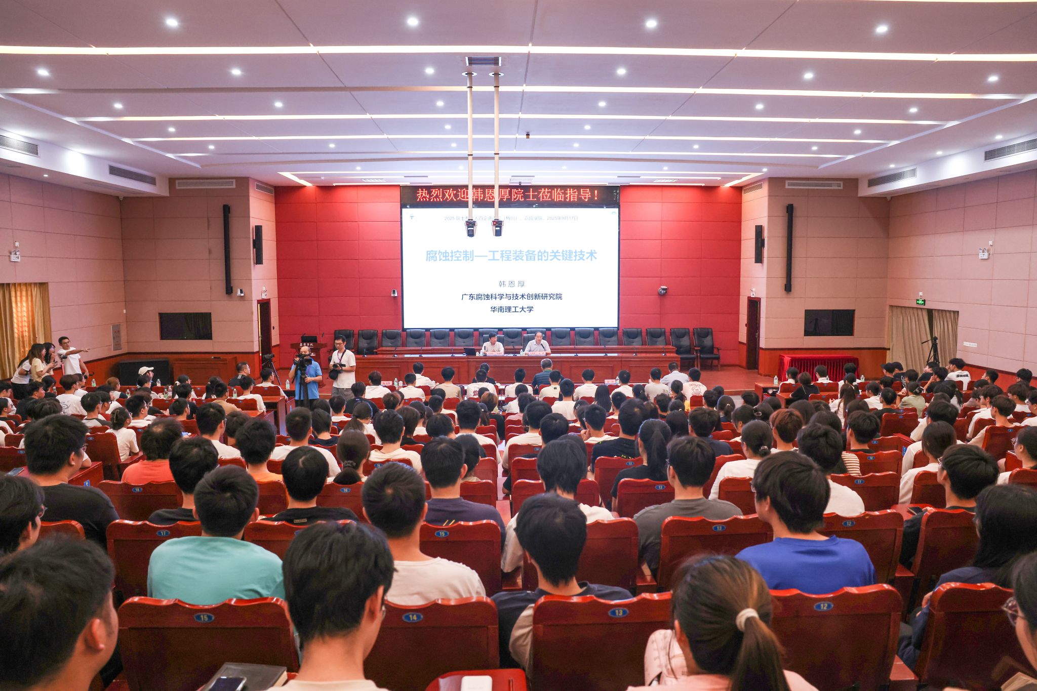 韩恩厚以深厚的学术功底和丰富的实践经验,结合核电、飞机、船舶等国家重大工程实践,用通俗易懂的语言解读腐蚀控制技术前沿成果。他从飞机和油气长输管道的环境服役寿命与安全性评价方法切入,详细阐述如何为重大工程结构“把脉问诊”,还介绍了团队研发的高性能防腐蚀系列技术,并分享了极端高温高压水试验条件的建设历程。生动的讲解让在场师生直观感受到腐蚀控制技术对国家工程安全的关键支撑作用,深刻领悟“科研服务产业、专业对接需求”的重要意义。