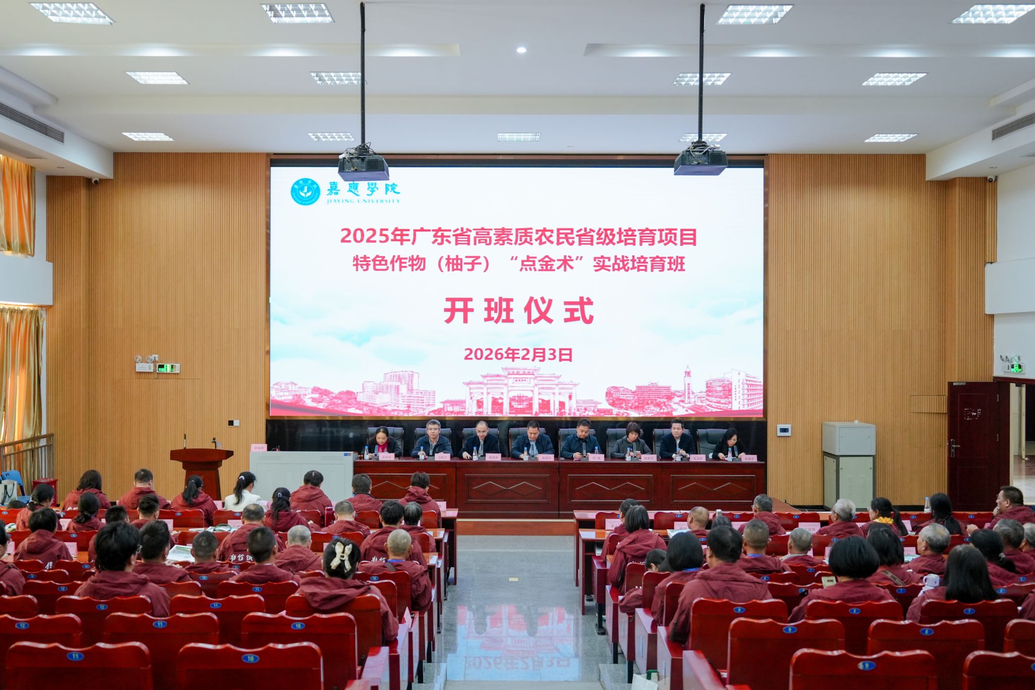 为学习贯彻习近平总书记视察梅州重要讲话重要指示精神,助力梅州苏区做优“土特产”文章,推动金柚产业提质增效,2月3日下午,2025年广东省高素质农民省级培育项目——特色作物(柚子)“点金术”实战培育班开班仪式在我校举行。学校副校长陈建存,广东省农业农村厅、广东省农产品质量安全中心、嘉应学院生命科学学院、梅州市农业农村局、梅州市农林科学院果树研究所相关负责人出席开班仪式,70位来自全省各地的柚子种植户、农业经营主体代表参加培训。
