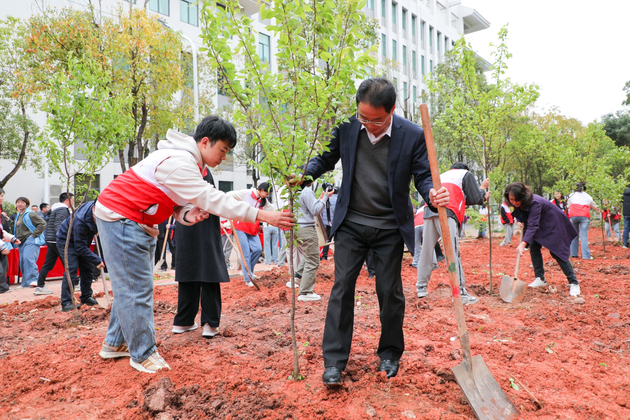 为打造绿美校园、绿美梅州,营造师生共同参与绿美生态建设的良好氛围,3月13日下午,学校在百年纪念大楼后开展共建“成长林”植树活动暨绿美生态建设承诺书签订仪式。学校校长陈文海,党委副书记罗任权,副校长罗嘉文、袁铎、张丽霞、廖志成,纪委书记苏文记等校领导与师生志愿者共150多人参加了活动。