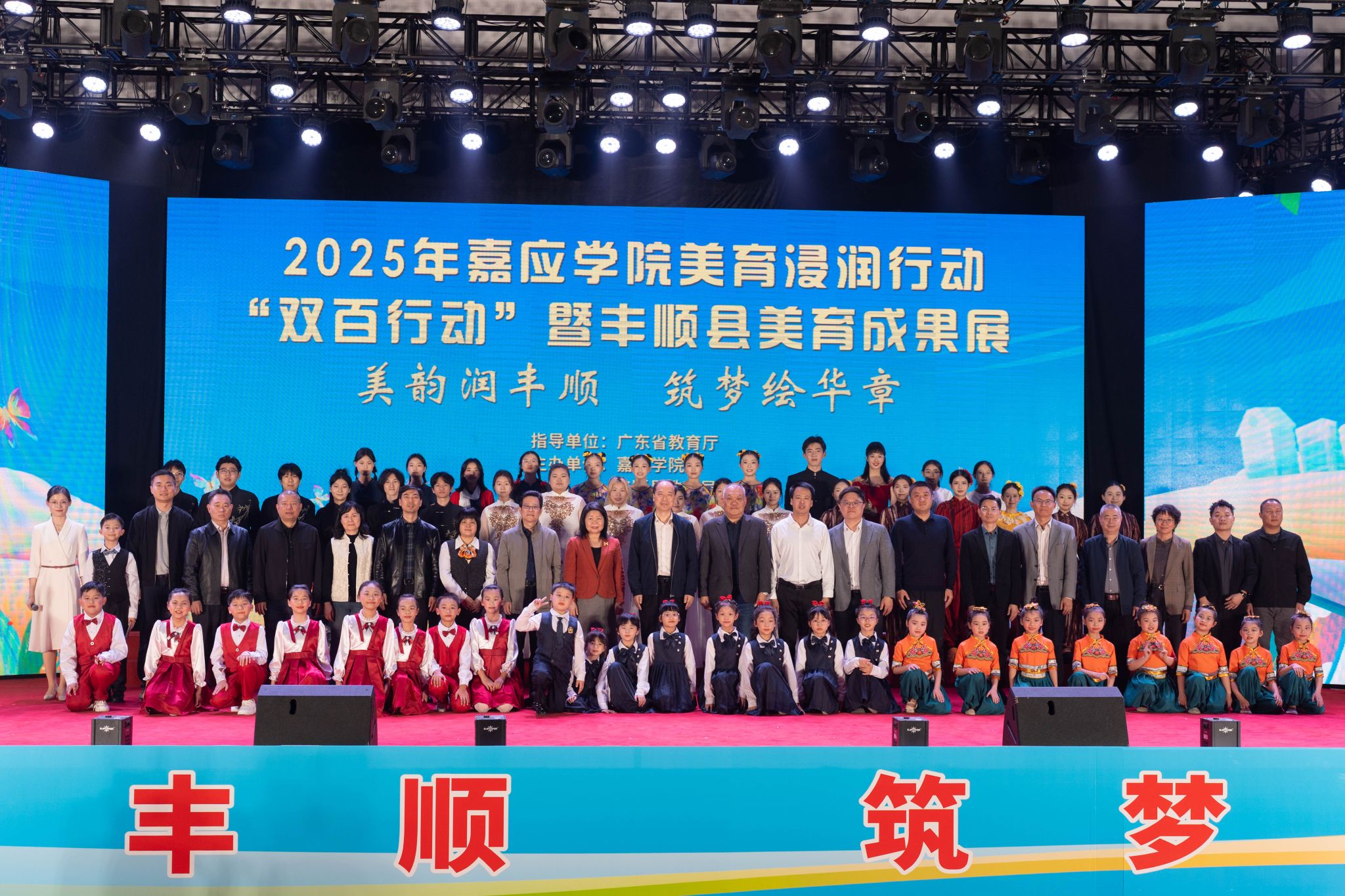 12月12日,我校与丰顺县教育局在丰顺县实验小学联合举办“2025年嘉应学院美育浸润行动、‘双百行动’暨丰顺县美育成果展”,学校副校长袁铎出席活动并致辞,相关二级单位负责人、美育浸润行动骨干师生,丰顺县教育局、基础教育学校主要负责人和师生代表共500多人参加了活动。