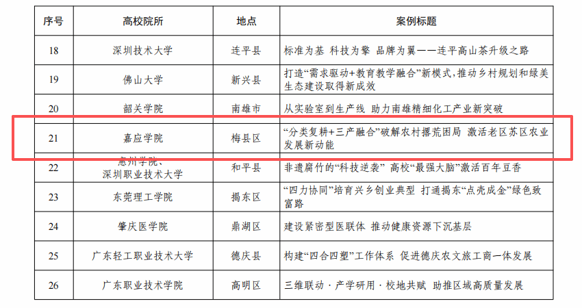 近日,广东省“百千万工程”指挥部“双百行动”专班办公室揭晓了2025年“双百行动”典型案例评选结果。全省各高校共有30个案例入选典型案例,我校报送的《“分类复耕+三产融合”破解农村撂荒困局 激活老区苏区农业发展新动能》案例成功入围,充分展现了我校在服务县域高质量发展中的创新实践与扎实成效。